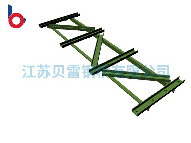 裝配式公路鋼橋由桁架式主梁、橋面系、聯接系、構礎四部分組成,并配有專用吊具。在車行道兩側,由每節長3米的桁架用銷子連接主梁,主梁之間用橫梁連接,每格桁架設兩根橫梁,每格桁架設4組縱梁,中間兩組無扣縱梁,外側兩組有扣縱梁,在縱梁上鋪設木質橋板,橋板兩側用緣材固定,橋兩端設有端柱。可以把U型橋板直接鋪在梁上。主梁經端柱支撐在橋座(座)和座板上,橋與出水處之間由橋頭搭板連接,中間為無扣搭板,兩側為有扣搭板﹐搭板上鋪設橋板,固定緣材。整個橋梁具有斜撐、抗風拉桿、支承架、聯板等多種連接系構件,使橋梁形成穩定的空間結構。