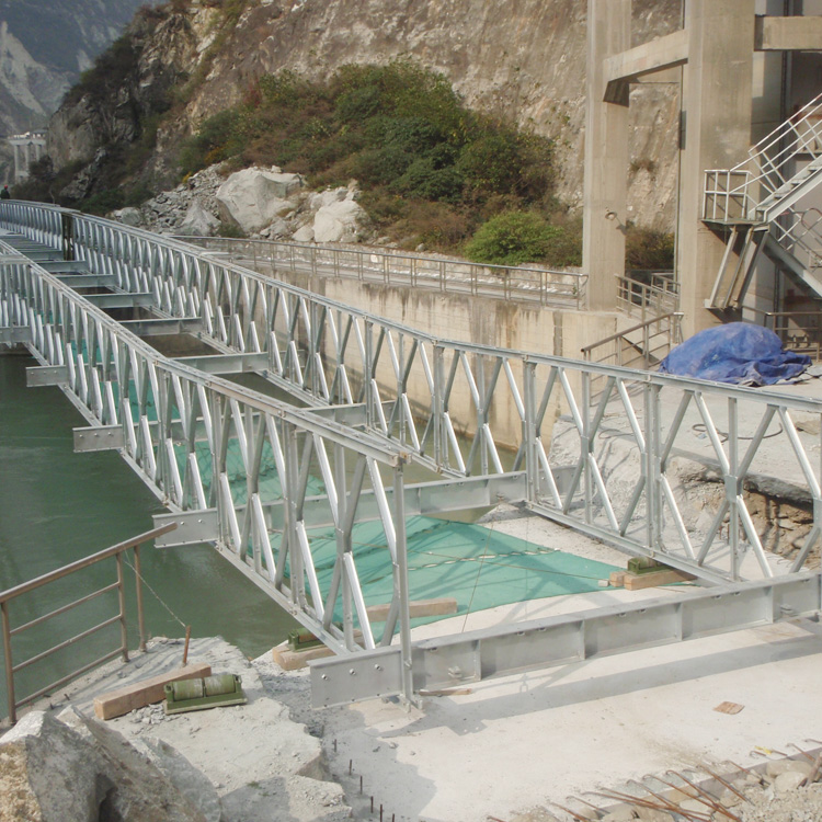 鋼便橋以高強鋼材制成輕便的標(biāo)準(zhǔn)化桁架單元構(gòu)件及橫梁、縱梁、橋面板、橋座及連接件等組成,用專用的安裝設(shè)備可就地迅速拼裝成適用于各種跨徑、荷載的桁架梁橋。在第二次世界大戰(zhàn)中,曾被大量用于歐洲及遠(yuǎn)東戰(zhàn)場,搶修橋梁或架設(shè)臨時便橋。戰(zhàn)后,貝雷銷橋經(jīng)過改進轉(zhuǎn)為民用。美國的改進型定名為阿克羅格構(gòu)式橋。中國公路部門采用16mn鋼材設(shè)計并定名為裝配式公路鋼便橋,一套器材可架設(shè)9、12、15……60、63米跨徑的單行道橋梁,通過汽車10級、汽車15級、汽車20級、履帶50、掛車80的荷載。這種橋梁構(gòu)件也大量用作施工支架或塔架。